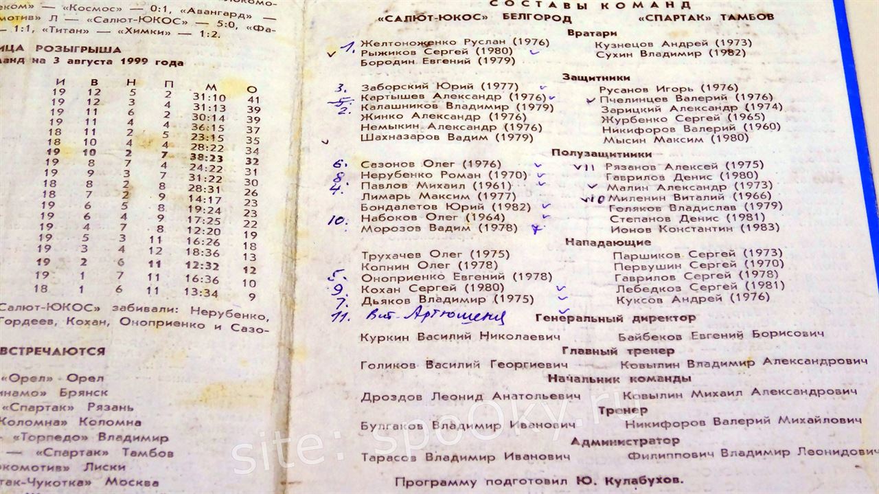 Год 1999. Вновь вернулся формат "витража" в виде 4 страничного сложения листа. Зато на обложке можно разглядеть забор Северной трибуны, находящейся на реконструкции. Тираж программок уменьшился с 200 до 150 экз. В составе появился 19-летний Сергей Рыжиков - вратарь, который позже станет не только защищать ворота Казанского "Рубина" но и станет капитаном данной команды. (программу с игры "Рубина" можно будет увидеть в конце статьи). Год стал провальным, Салют занял 19 место, став аутсайдером и вышел из 2 дивизиона. Программка: Салют-Юкос - Спартак Тамбов
