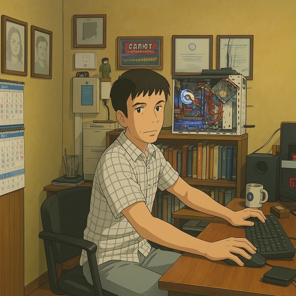 Вот пример - я не нашел свою хорошую фотографию, поэтому погрузился в архив, нашел фото, где я такой деловой в кабинете своем сижу и попросил сделать в стили Ghibili. Вот результат.