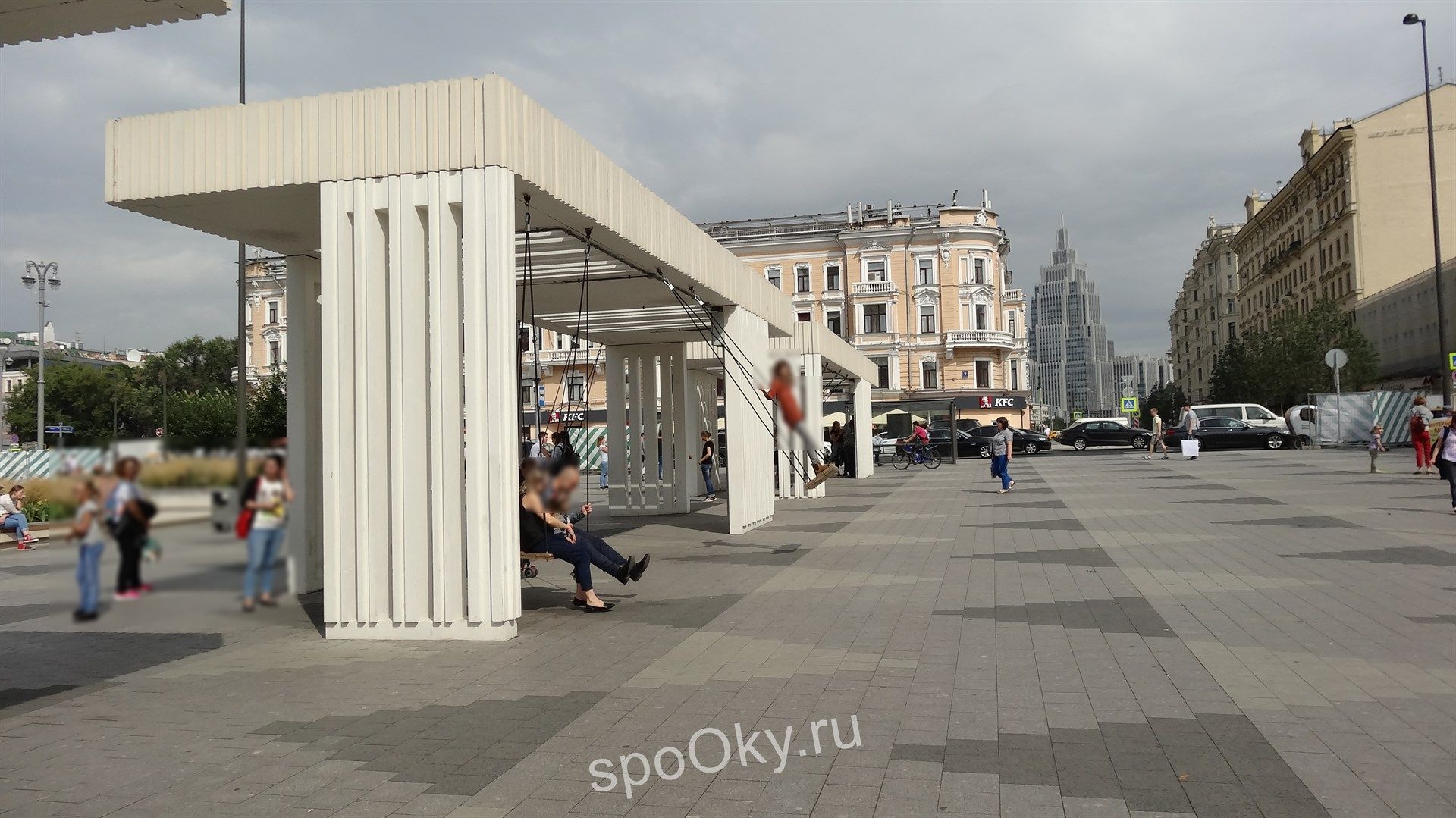 После планетария мы дошли до Маяковского, где, во-первых, расположен театр Сатиры, во-вторых забавные качели-остановка.
